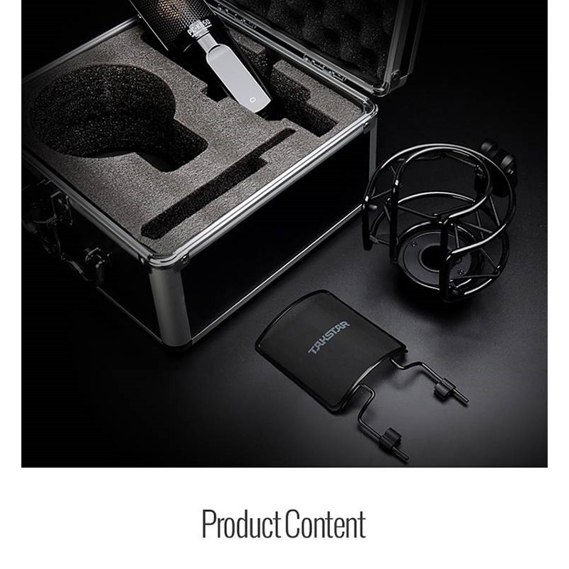 TAKSTAR K850 è un microfono da registrazione equipaggiato con una capsula a diaframma largo da 32mm placcata in oro. Accanto alla ricerca tecnica che ha avuto come risultato un microfono con prestazioni superlative, larga attenzione è stata data anche alle caratteristiche di design: una bellissima ed elegante cosmesi lucida che ricorda quella di un prezioso pianoforte in legno laccato rende K850 unico e consigliato in tutti gli ambienti dove oltre al risultato tecnico è richiesta presenza e stile. Grazie alla generosa capsula a diaframma largo da 34mm glod plated la riproduzione del suono è estremamente pura e naturale. Registra e riproduce la voce in modo cristallino L'housing in metallo resistente e massiccio è stato arricchito con un antipop in metallo integrato progettato appositamente che si sposa perfettamente con il corpo del microfono preservandone l'aspetto compatto. Il supporto antischock, fornito nella confezione è estremamente stabile e previene ogni vibrazione completando l'efficace design anti-interferenze. Fornito con una elegante e leggera custodia in alluminio nero per un trasporto sicuro o per riporre in sicurezza il microfono quando non in uso