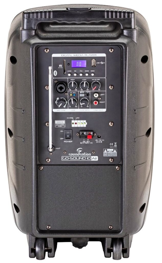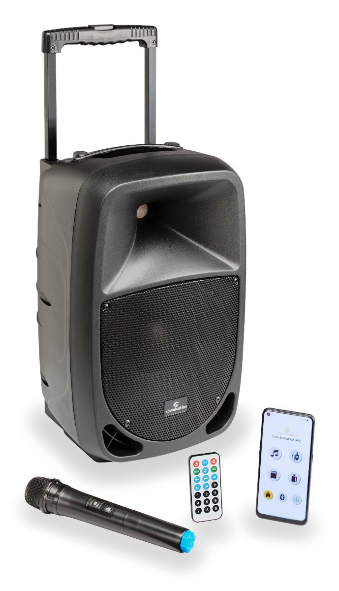 Soundsation Go-Sound fa un altro passo avanti e diventa Go-Sound Air. Mantenendo tutte le funzionalità della precedente serie Go-Sound AMW (alimentazione a batteria o corrente, radiomicrofono VHF, Player con USB/SD-card/BT, Ingressi Mic/Line, EQ a 2-Bande, ecc.), è ora possibile controllare il lettore multimediale e l’ingresso stereo Aux tramite la nuova app “Go-Sound Air” per dispositivi Android® e iOS® (scaricalo da Google Play® o AppStore®). Non è mai stato così facile suonare e controllare le tue playlist preferite dal tuo telefono cellulare o tablet: collega il diffusore all’app tramite connessione BT e il gioco è fatto. Così come per la precedente serie AMW, la batteria dura fino a 12 ore (volume medio carica completa). L’amplificazione è in Classe-D da 360W di picco (con alimentazione a corrente). Il cabinet è in polipropilene robusto e leggero con griglia metallica, foro per stativo da 36mm e spugna acustica per proteggere il woofer e conferire un look piacevole.